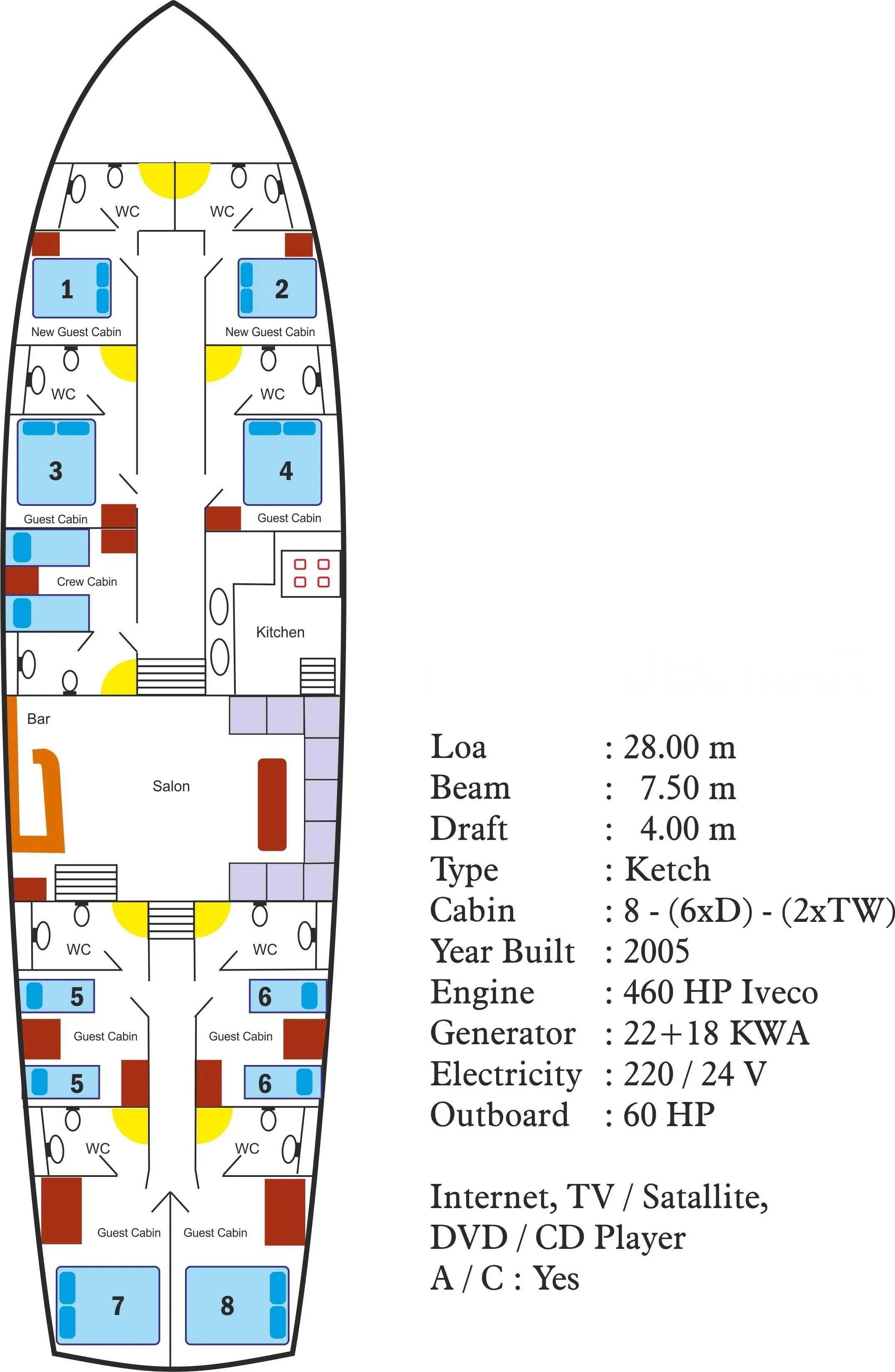 | Kabin Dağılımları | 6 Double, 2 Twin |