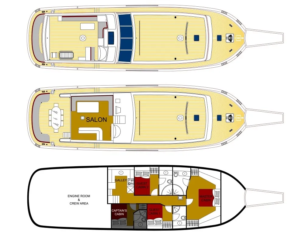 Guletimizde 1 master, 2 double olmak üzere toplam 3 kabinli tekne düzeni sunulmaktadır. Her kabinde özel duş, tuvalet ve klima bulunmakta olup, 6 kişilik kapasitesi ile aileler ve arkadaş grupları için konforlu bir konaklama imkanı sağlamaktadır.