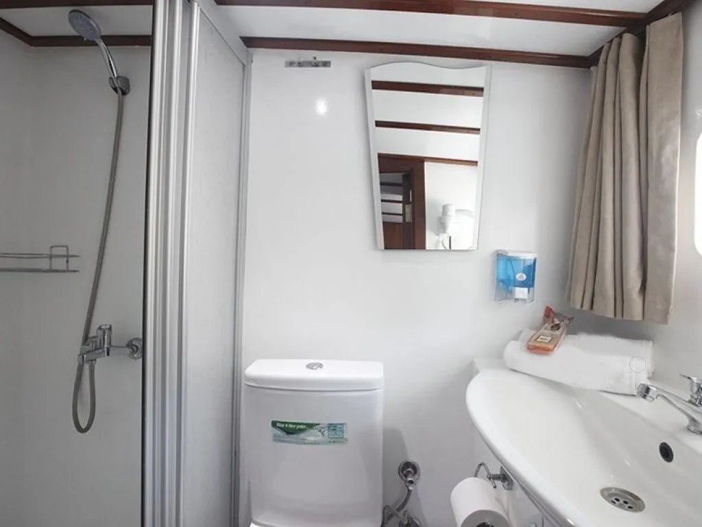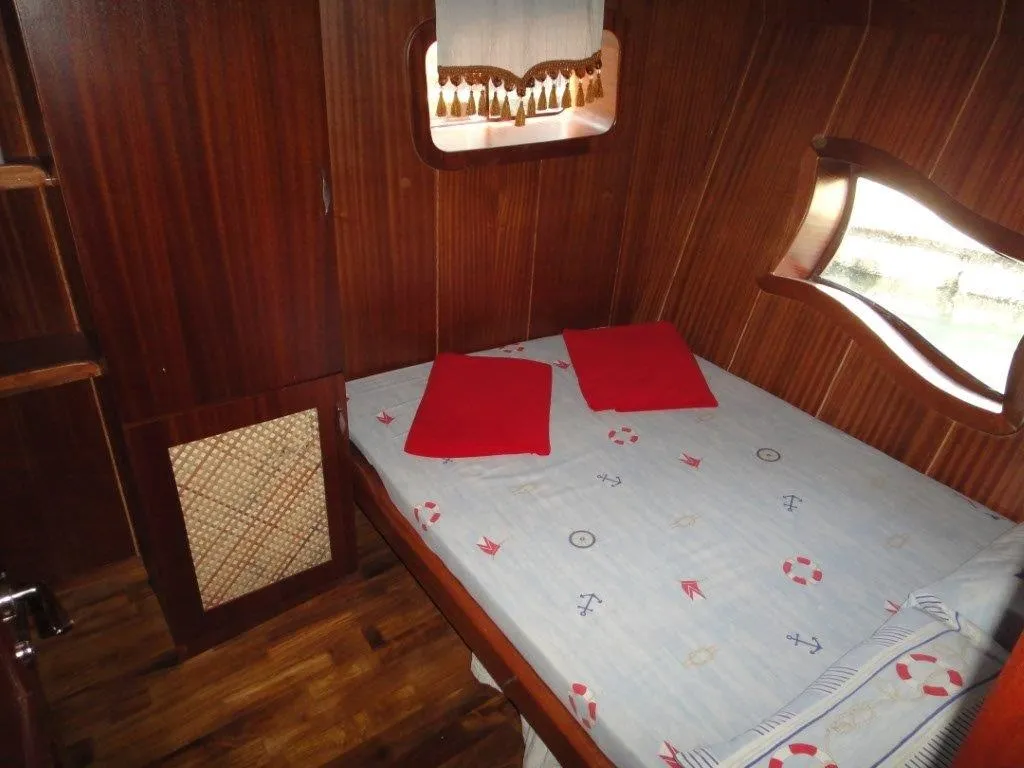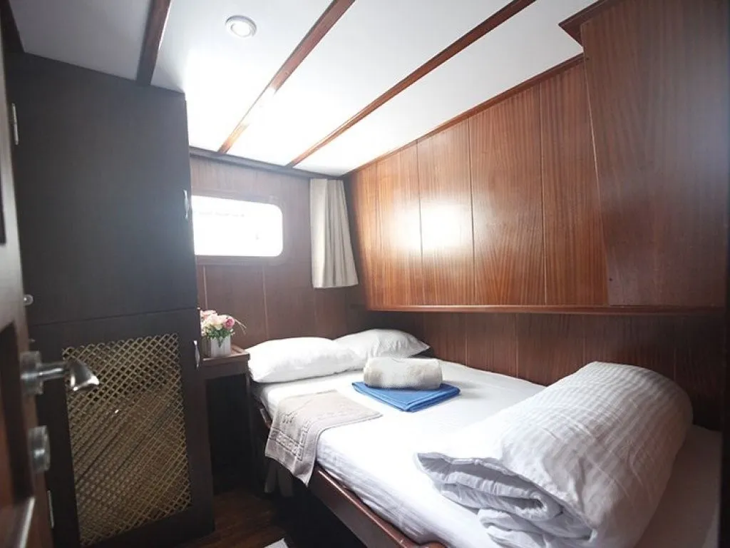1998 yılında inşa edilen teknemiz, 2017 yılında tamamen yenilenmiş olup, 8 double kabini ile 16 kişilik gruplara konforlu bir konaklama imkânı sunmaktadır. Her kabinde klima, özel duş ve wc bulunmakta olup, misafirlerimizin rahat bir tatil geçirmesi için gerekli tüm donanımlara sahiptir.