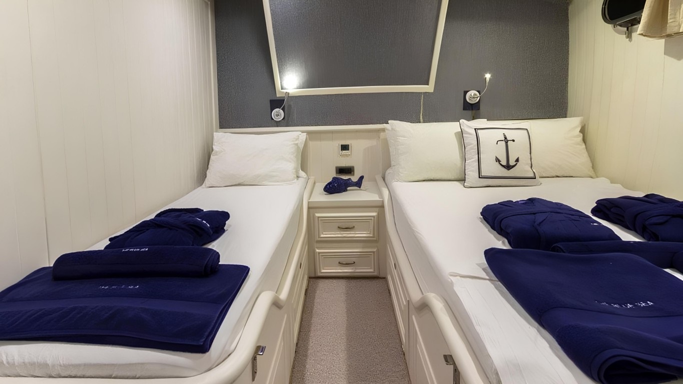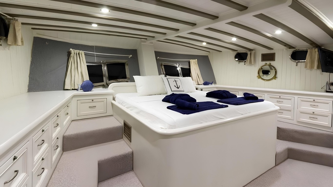 Toplam 5 kabini bulunan gulet, 12 kişiye kadar konaklama kapasitesine sahiptir. Kabin dağılımı misafir konforu düşünülerek planlanmıştır. Teknenin içinde 2 master kabin, 1 double kabin ve 2 triple kabin yer almaktadır. Her kabinde özel banyo, rahat yataklar, depolama alanları ve gün içinde 6 ila 8 saat kullanılabilen klima sistemi bulunmaktadır. Bu özellikler, hem aileler hem de arkadaş grupları için ideal bir konaklama ortamı yaratır.