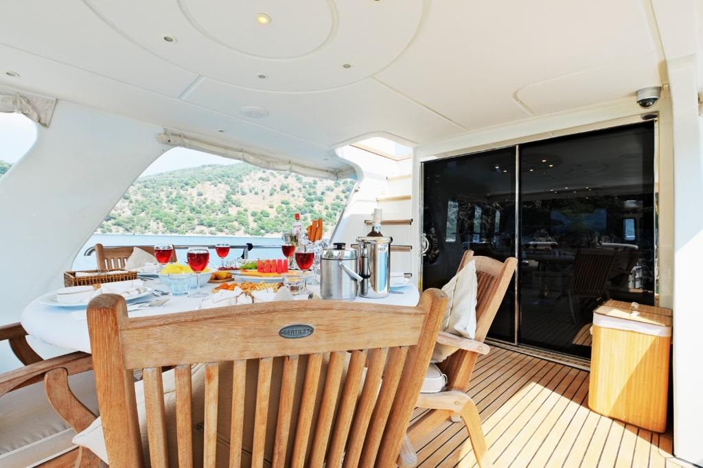 Teknenin ön bölümünde güneşlenme minderleri ile güneşin tadını çıkarabilir, arka bölümdeki yemek masasında sevdiklerinizle keyifli akşam yemekleri yiyebilirsiniz. Tatilinizin en unutulmaz anlarını ise flybridge alanında yer alan rahat oturma grupları ve minderlerle taçlandırabilirsiniz.