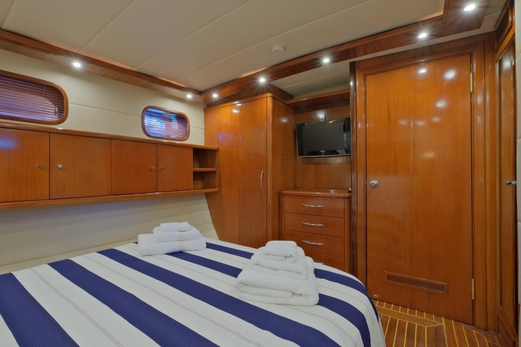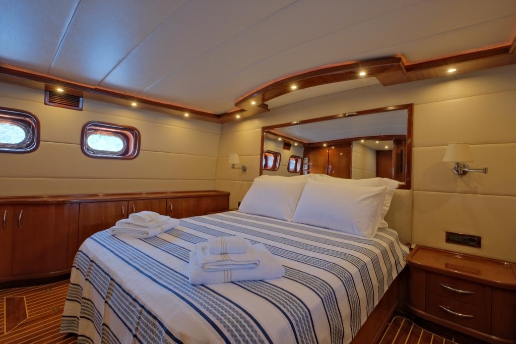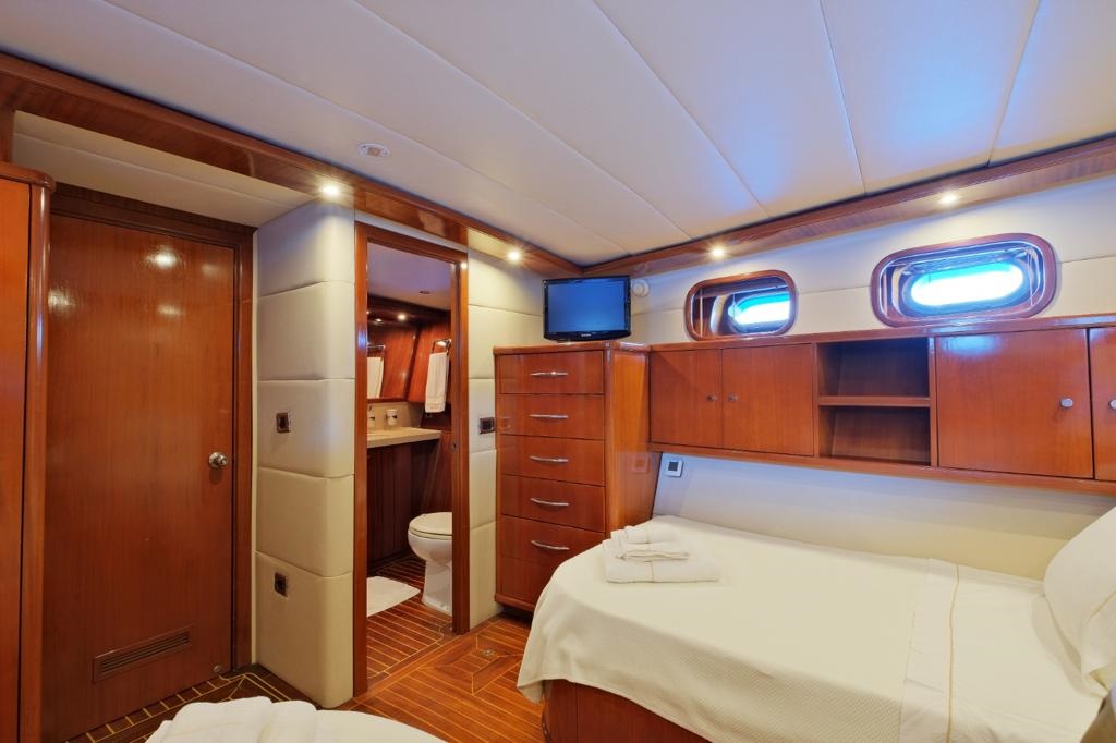 3 kabinli olan yatımızda 2 master ve 1 twin kabin yer almakta, twin kabindeki yataklar ihtiyaca göre double yatağa dönüştürülebilmektedir. Her kabinde klima, tv, duş ve özel wc bulunurken, salon da dahil olmak üzere tüm alanlar klimalıdır ve zarif mobilyalarla döşenmiştir.