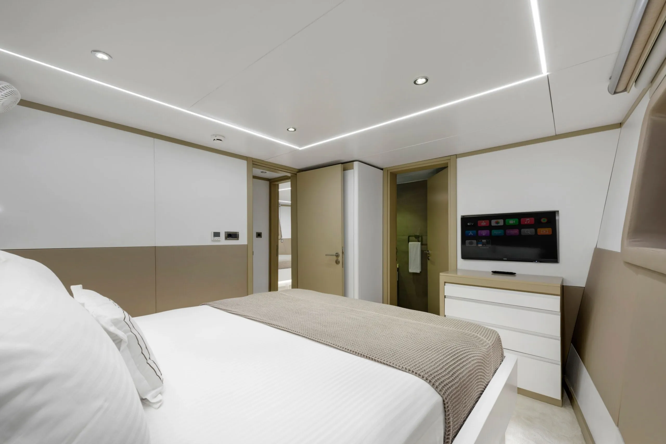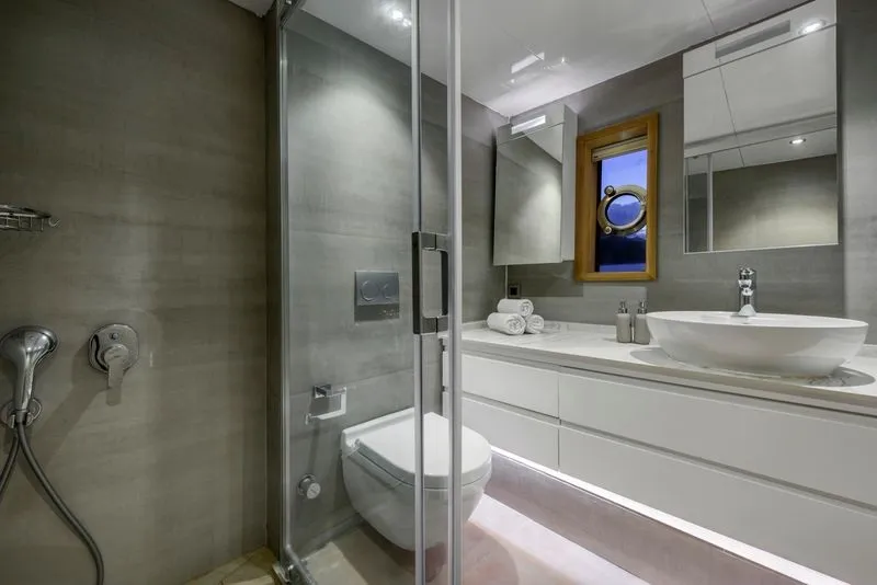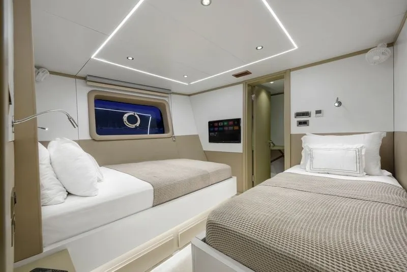1 master, 2 double ve 1 triple kabin düzeniyle toplam 9 kişiye kadar konaklama imkanı sunan kiralık lüks yat Tanway, konforu ön planda tutan detaylarıyla misafirlerine ev sıcaklığında bir tatil vadediyor. Master kabin özel makyaj masasıyla kişisel alanınızı genişletirken, kesintisiz 24 saat klima hizmeti her an ferah bir atmosfer sağlıyor.