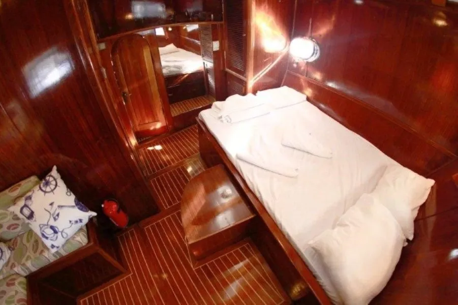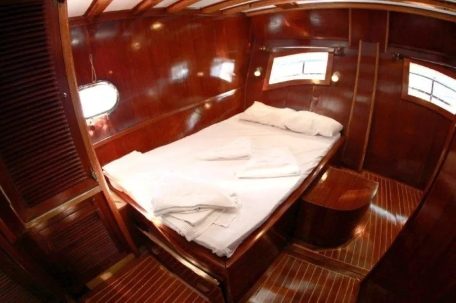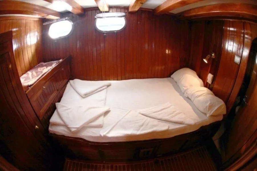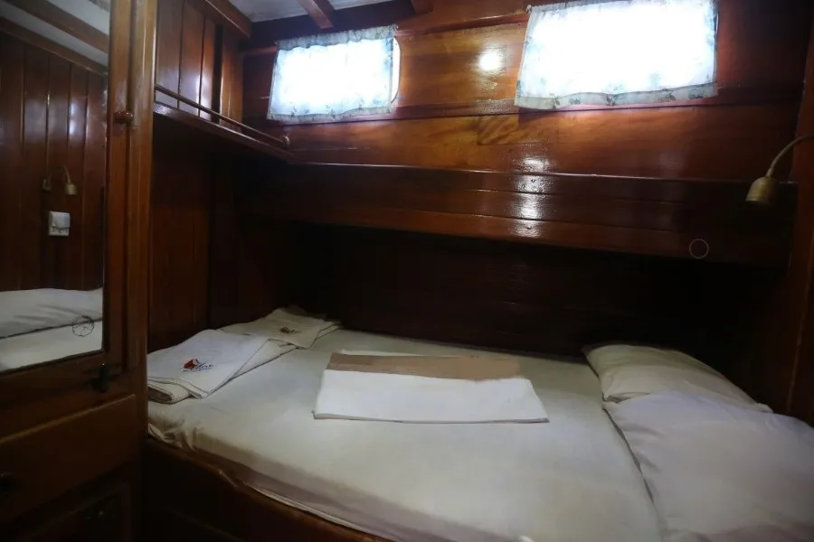 Urania Gulet’te 2 master ve 2 double kabin bulunmakta olup toplam 8 kişi konaklayabilir. Tüm kabinlerde duş, tuvalet ve gün içinde 4 – 6 saat hizmet veren klima sistemi mevcuttur. Teknemiz, uygun hava şartlarında yelken seyri yapılmasına olanak tanıyan ana yelken ve cenova yelken donanımına sahiptir.