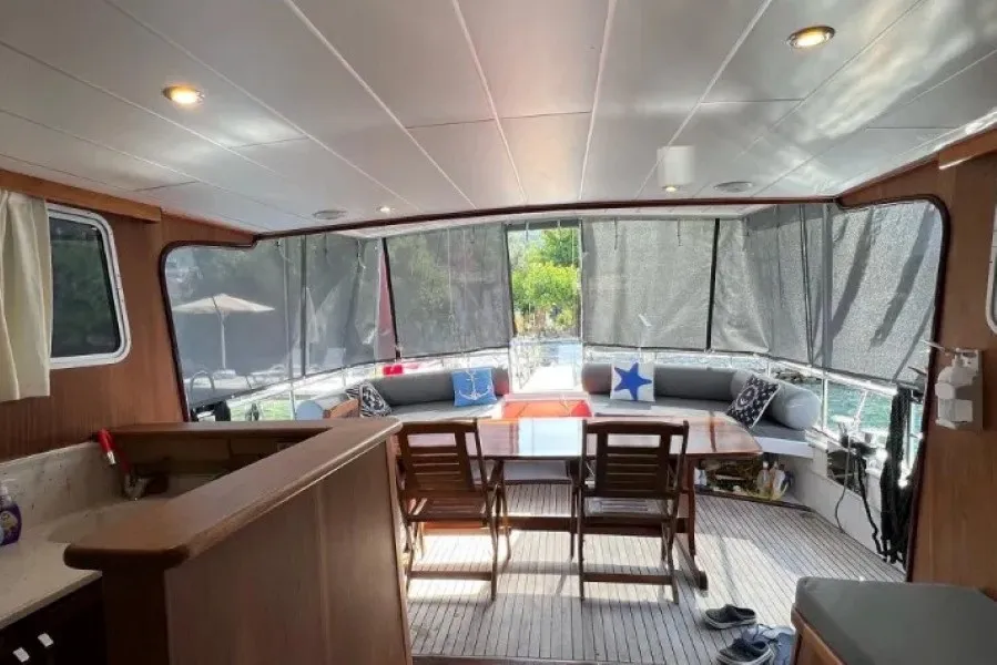 Geniş ön güvertesinde yer alan oturma grubu ve güneşlenme minderleri, mavi yolculuk boyunca gün batımı manzaralarına eşlik ederken dinlenmenizi sağlar. Arka güvertede bulunan yemek masası ve flybridge bölümündeki dinlenme alanı ise günün her saati için alternatif yaşam alanları sunar.