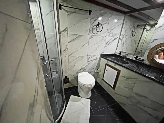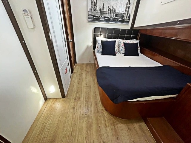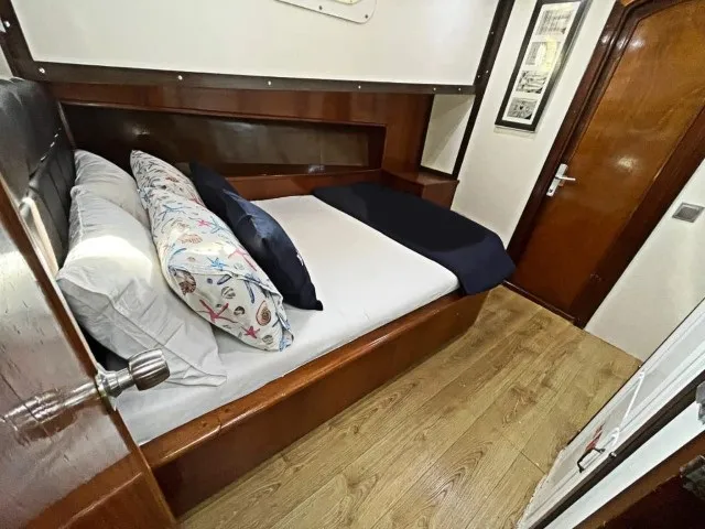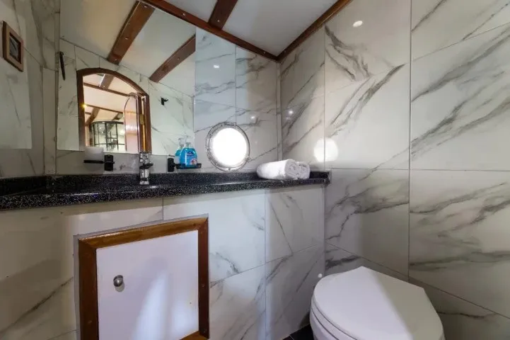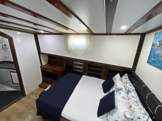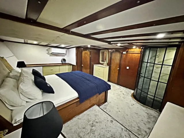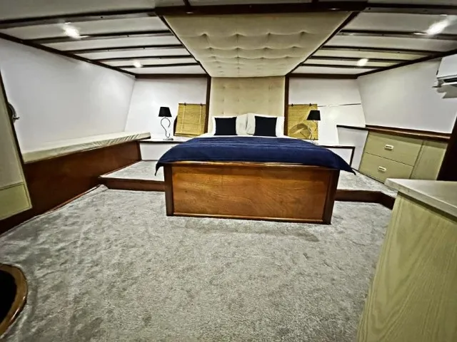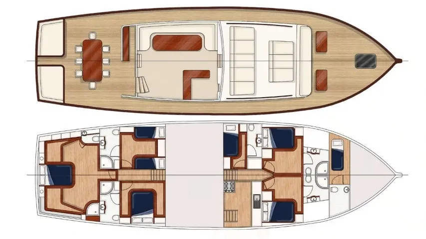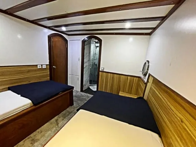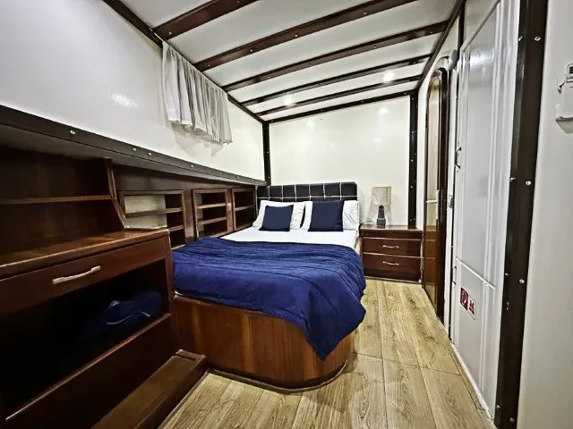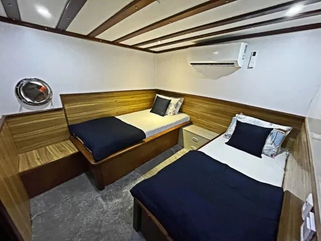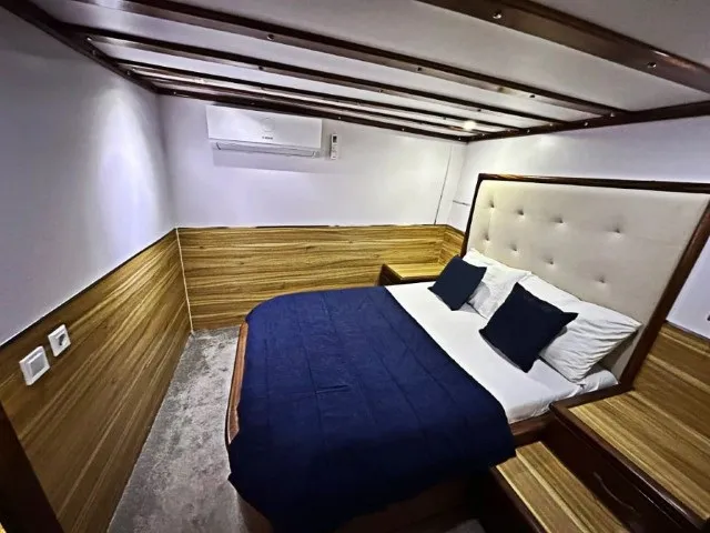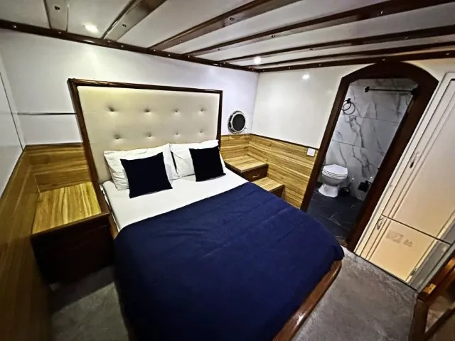 1 master, 3 double ve 1 twin kabin olmak üzere toplam 5 lüks kabiniyle 10 kişiye kadar olan özel grupları ağırlayabilen teknemiz, her kabininde duş, ev tipi wc, klima ve rahat konaklama imkânı sunar. 8-12 saat arası kesintisiz klima kullanımı ile yaz sıcaklarında konforunuz her zaman ön plandadır.